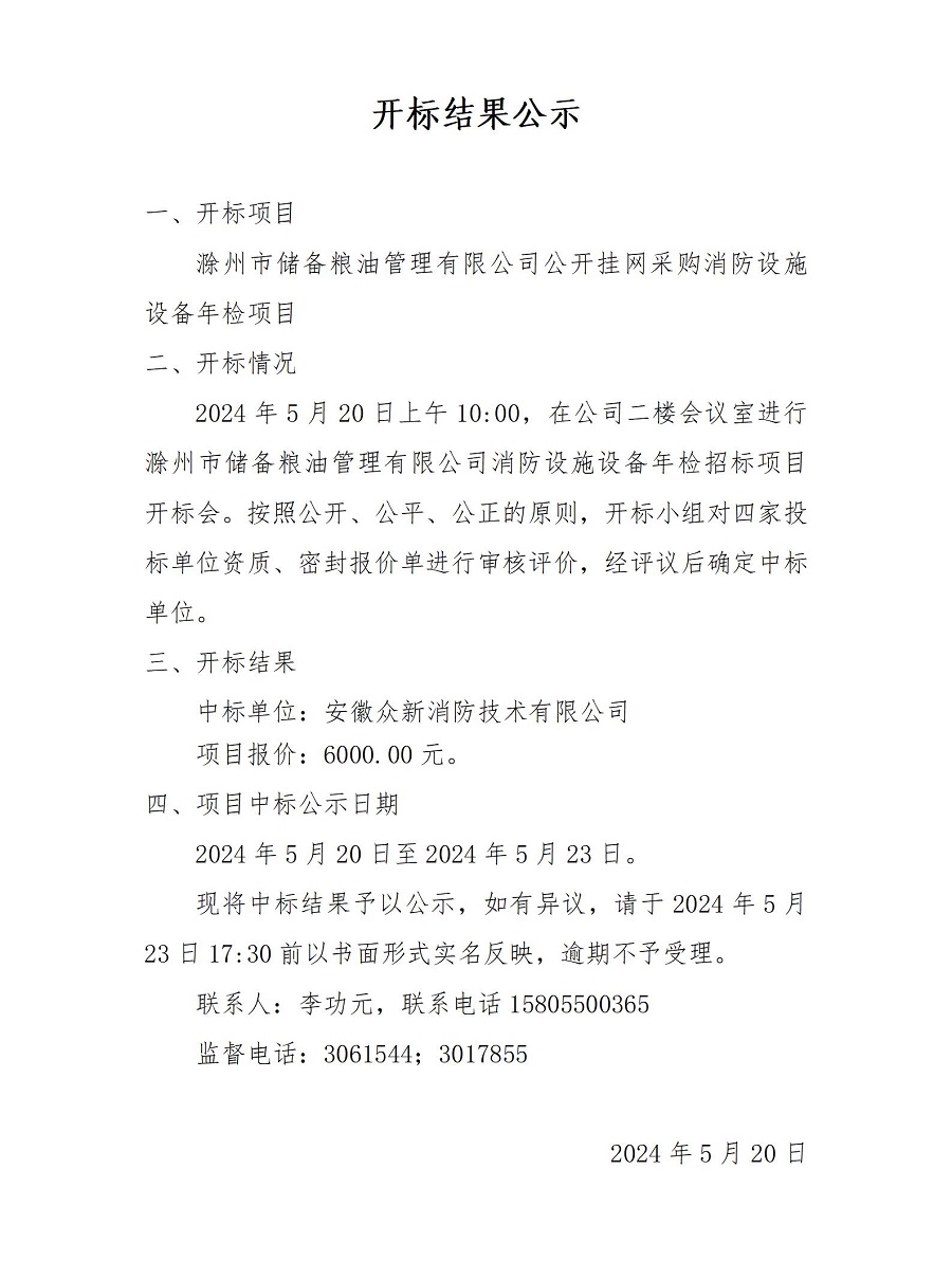 滁州工投新能源開發有限公司維修改造服務單位招標(二次) 中標候選人公示