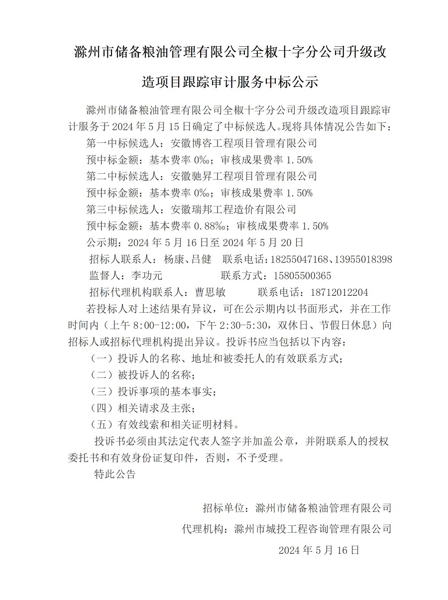 滁州市儲備糧油管理有限公司全椒十字分公司升級改造項(xiàng)目跟蹤審計(jì)服務(wù)中標(biāo)公示
