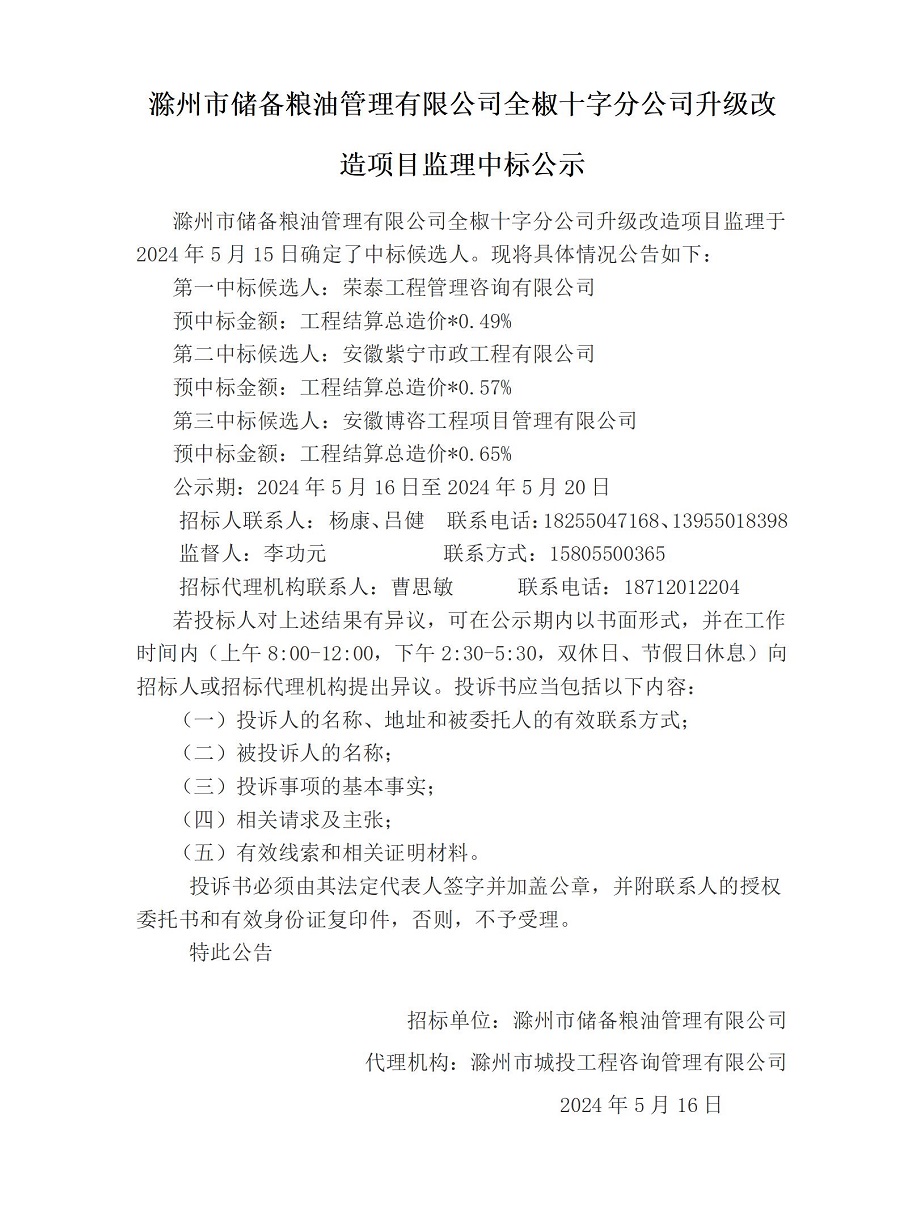 滁州市儲備糧油管理有限公司全椒十字分公司升級改造項(xiàng)目監(jiān)理中標(biāo)公示