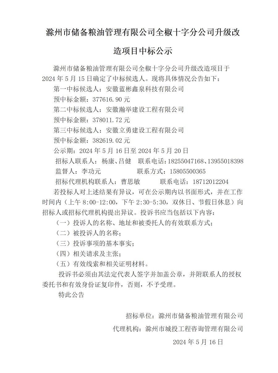 滁州市儲備糧油管理有限公司全椒十字分公司升級改造項(xiàng)目中標(biāo)公示