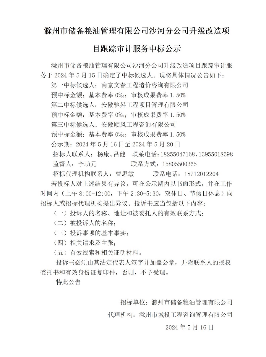 滁州市儲備糧油管理有限公司沙河分公司升級改造項(xiàng)目跟蹤審計(jì)服務(wù)中標(biāo)公示