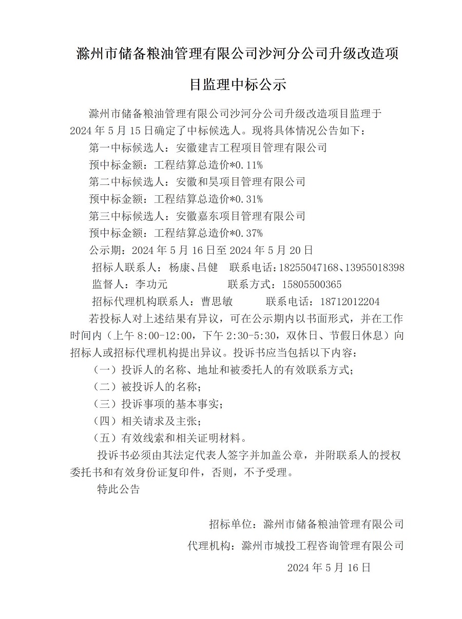 滁州市儲備糧油管理有限公司沙河分公司升級改造項(xiàng)目監(jiān)理中標(biāo)公示