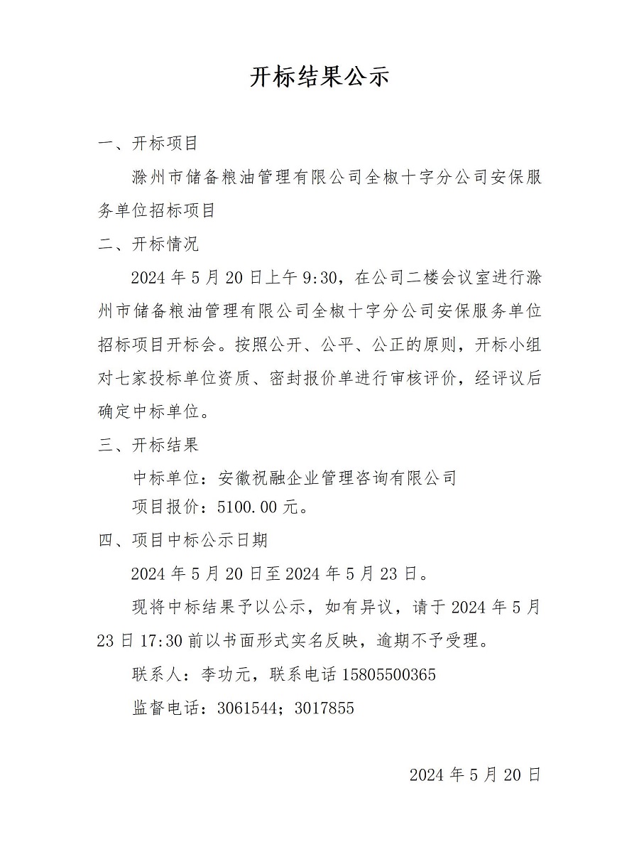滁州市儲備糧油管理有限公司全椒十字分公司安保服務(wù)公開掛網(wǎng)招標(biāo)公告滁州市儲備糧油管理有限公司現(xiàn)采用網(wǎng)上公開招標(biāo)的方式確定全椒十字分公司安保服務(wù)單位,歡迎各有資質(zhì)公司積極參與,現(xiàn)將相關(guān)情況說明如下:一、采購內(nèi)容及相關(guān)要求:1、人員配備:2人(男性)。2、工作地點(diǎn):滁州市儲備糧油管理有限公司全椒十字分公